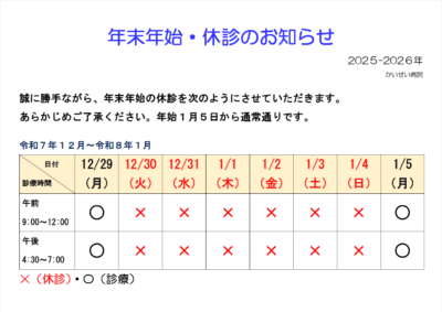 2025年7月18日 / 最終更新日時 : 2025年7月18日 かいせい病院 お知らせ お盆休みのお知らせ 誠に勝手ながら、 下記の通り当院の休診日とさせていただきます。 詳しくは下記を御覧ください。 PDF版はこちらからダウンロード下さい。