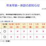2025年11月17日 / 最終更新日時 : 2025年11月17日 かいせい病院 お知らせ 年末年始・休診のお知らせ 誠に勝手ながら、 年末年始の休診を次のようにさせていただきます。 詳しくは下記を御覧ください。 PDF版はこちらからダウンロード下さい。